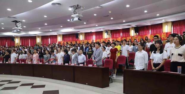 新生代表发言结束,主持人王宇晖副院长宣布全体起立,奏唱校歌。典礼结束后全体师生合影留念。