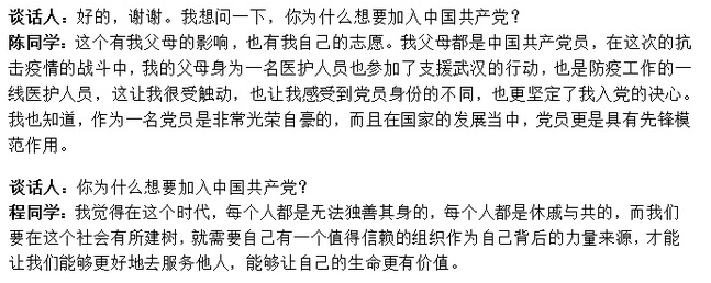 各位谈话对象对组织的提问均作了认真的回答,并详细阐述了自己的入党动机,表示要不断用党的理论思想武装头脑,积极向党组织靠拢,以党员的标准严格要求自己,争取早日成为一名合格的共产党员。