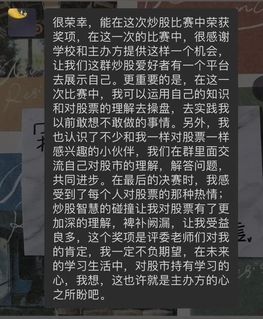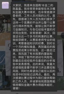 看!复赛的选手们正积极分享着自己对股市走向的了解,他们各抒己见,分享最近股市收入的小心得。而每位工作人员也乐意奉献,每天的小知识也准时推送给每一位参赛选手,让他们能在此次活动中有更多的收获。