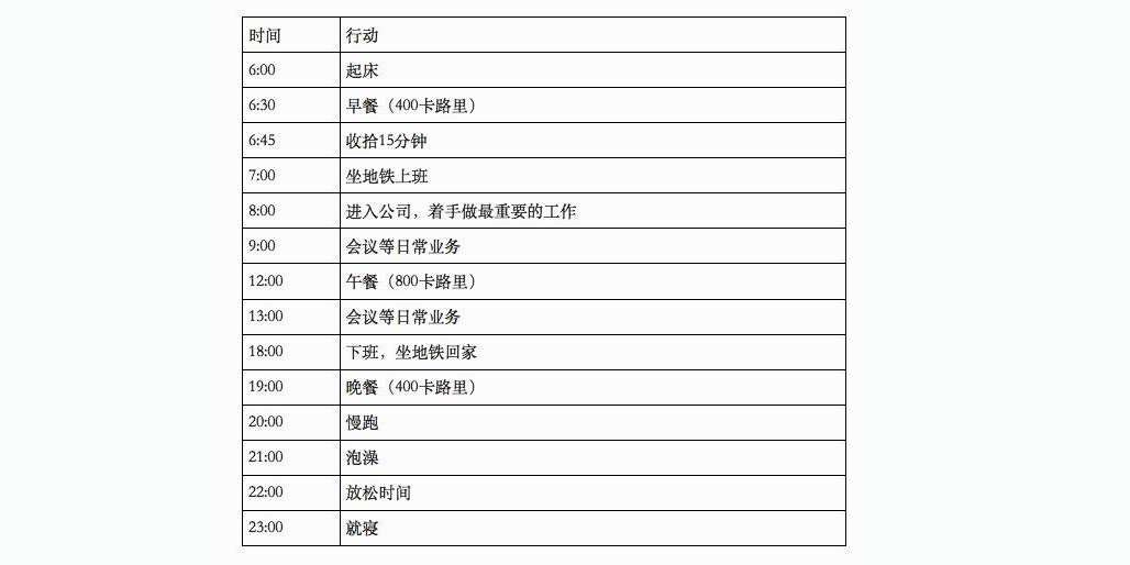 乍一看会觉得下面这张理想日程表如同机器一般,死板且不切实际。所以,制作这张理想日程表并不是切实地去实行,只是为了让我们明确以下两个要点:要想保证就寝时间,必须要在几点前完成工作;必须要保持一种怎样的生活状态。