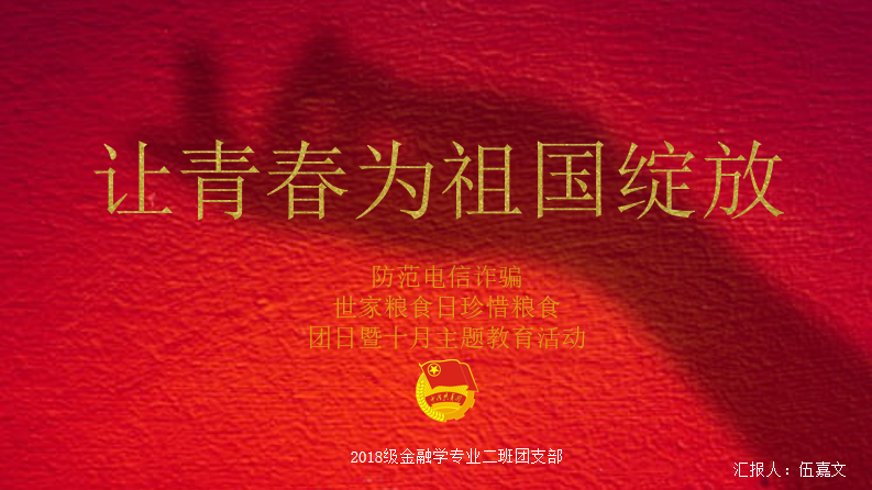 为响应基层团支部“活力提升”工程,贯彻《广东财经大学基层团组织“活力提升”工作方案》精神,充分发挥基层团支部凝聚、引导、服务青年的功能,Betway必威西汉姆联18、19、20级各班团支书围绕“让青春为祖国绽放”的大主题展开了以“案例警示教育”“秋季心理健康教育”“世界粮食日珍惜粮食”等相关小主题的系列团日活动,并于2020年10月21日晚进行了团支部风采展示活动。