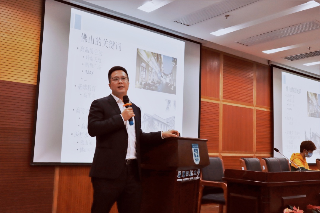 徐旭雁副局长首先围绕佛山和大湾区的关键词,从地理位置、交通建设、产业发展、经济体系、城市环境、教育医疗体系等方面介绍了佛山市基本情况,并强调佛山市作为大湾区城市群之一,在未来将拥有相对多的发展机遇和更为广阔的发展空间。佛山市政府也将以高起点、国际化为标准建设佛山校区,并与佛山产业紧密结合,优化办学条件,提高师资力量。同时,徐旭雁副局长还以自己大学毕业后的工作经历和宝贵经验,鼓励大学生珍惜大学时光,提高自身的专业知识水平、实践能力及开拓创新精神。
