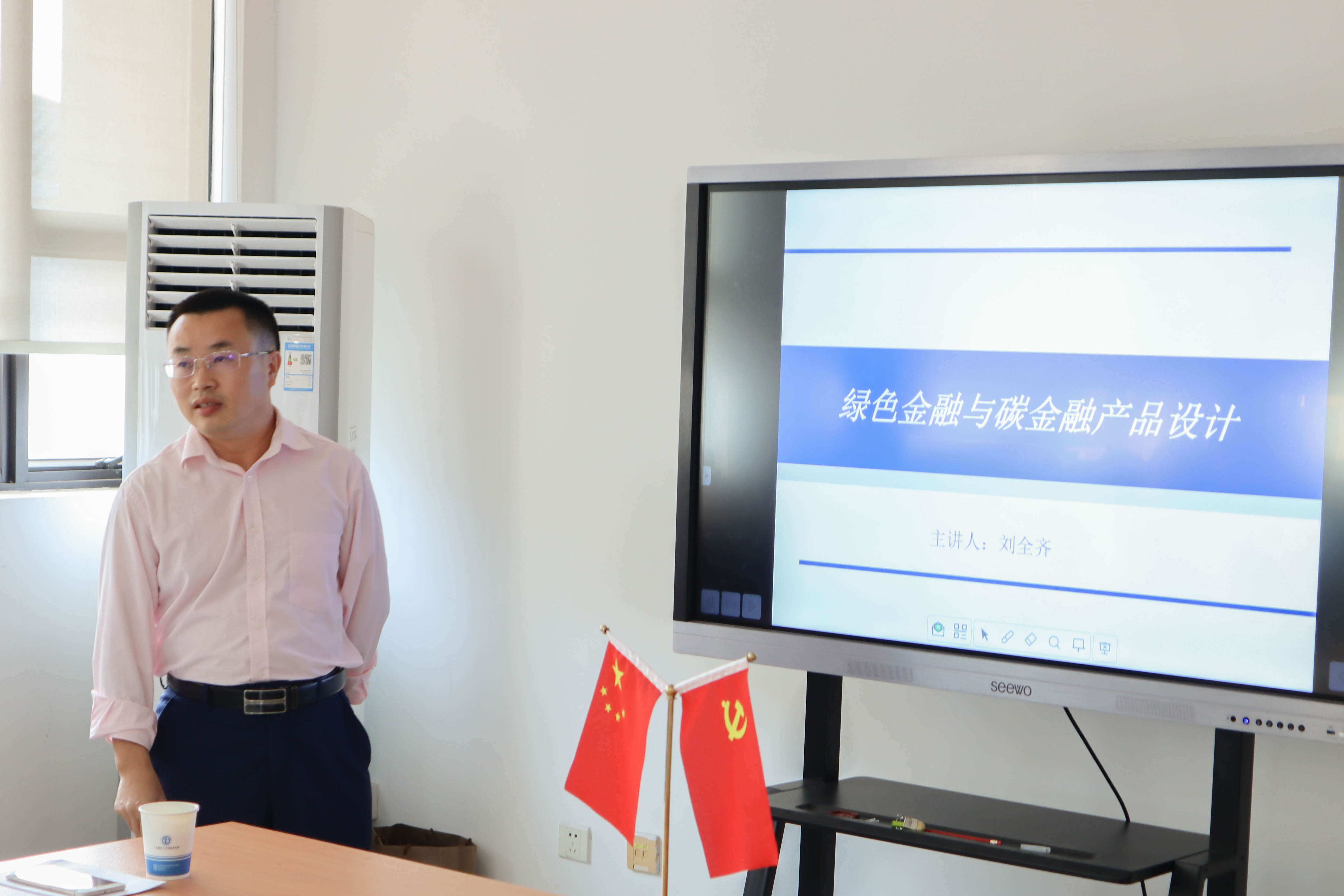 首先,刘全齐老师进行了《绿色金融与碳金融产品设计》课题的阐述。刘全齐老师从世界经济快速发展带来的环境问题日渐突出谈起,引出我国绿色金融发展的背景。其次刘全齐老师列举了成立金融改革创新试验区、推出绿色金融产品等绿色金融发展的现状,并指出这些举措使用于支持绿色项目的资金增加,可以促进节能减排和低碳发展,从而带动相关地区金融的繁荣。