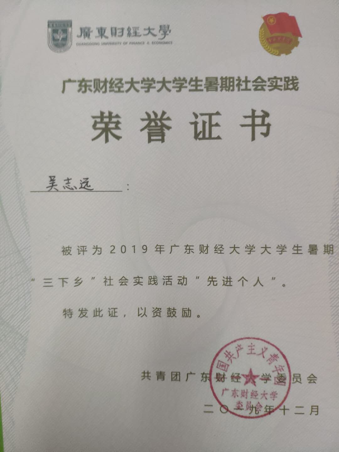 知是基础和前提,行才是重点和关键,必须要做到知行合一,重在行。我积极参加校内外的志愿服务和社会实践活动,丰富自己的社会阅历,锻炼自己的实践能力。在校内活动中,我参加了迎新志愿服务、学校寒招实践和暑期三下乡赴广西贺州脱贫攻坚社会实践,对志愿者精神、学校招生工作、脱贫攻坚政策有了更真切的了解,并获得了校级暑期社会实践先进个人荣誉。居家期间,我参加了返乡防疫志愿服务、“五四”县情研修实践活动和“七彩假期”支教活动,为家乡建设作出应有的贡献。