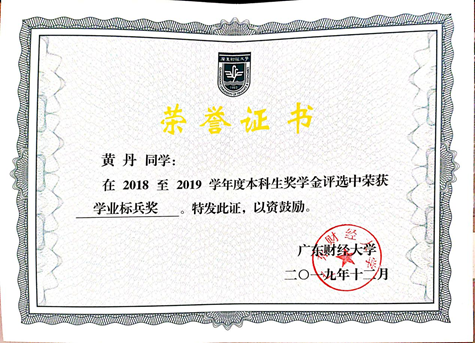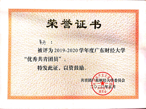 2018-2019年和2019-2020年校优秀共青团员、2018-2019年学业标兵奖、2019-2020年学业优秀奖、2019年“好策杯”英语读书报告优秀奖、2020年“好策杯”朗读大赛获优秀奖。