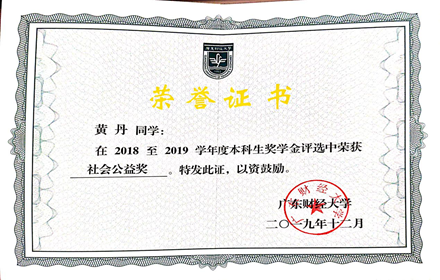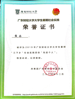 暑期社会实践调研项目获校级立项、社会实践先进个人称号、2018-2019年、2019-2020年获得社会公益奖、2019-2020年道德风尚奖、2018-2019年、2019-2020年“优秀志愿者”称号、担任寒招队长,带领团队获寒招社会实践宣传志愿活动校级二等奖。