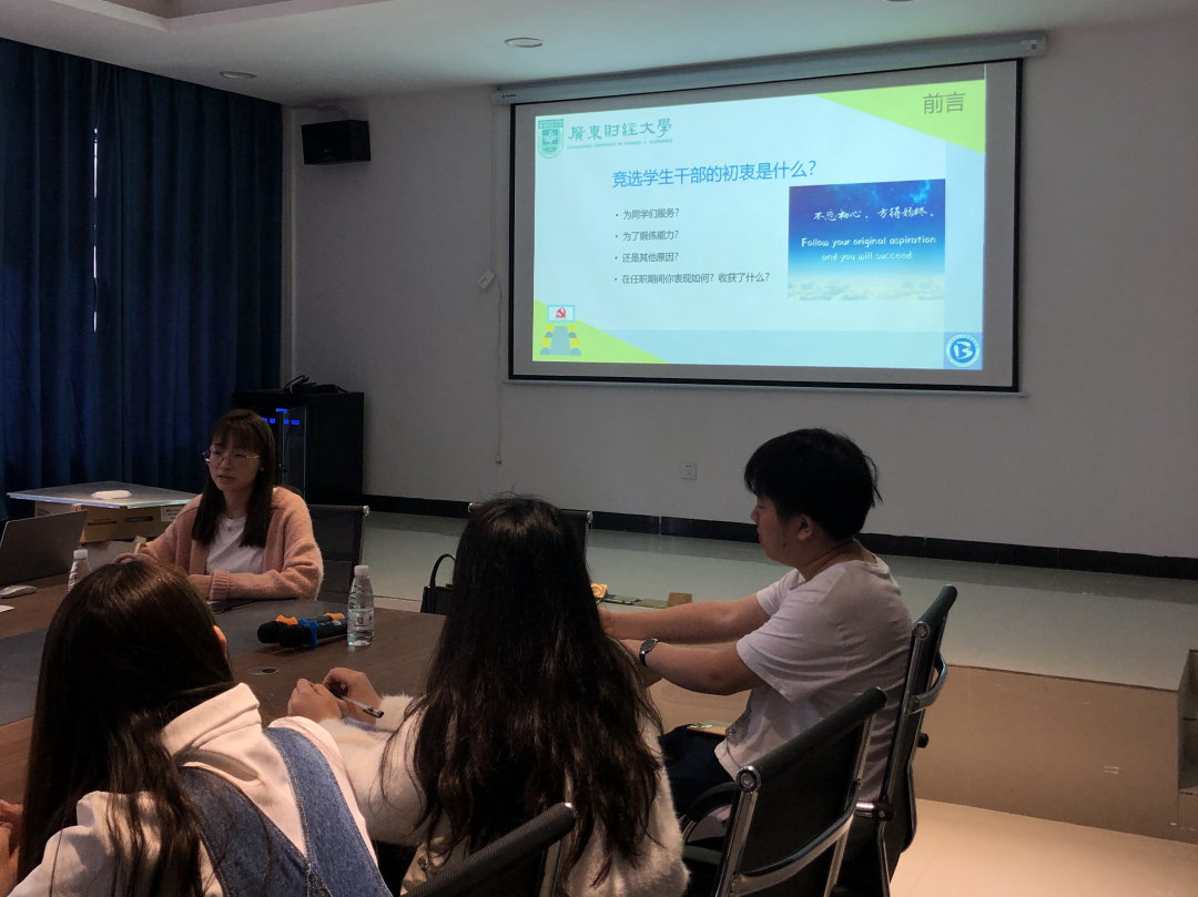 会上,吕阳老师由“竞选学生干部的初衷是什么”这个问题引出此次培训会的内容。此次培训会的主要内容分为四部分。第一部分:做好工作汇报。班委要向辅导员汇报工作进程和结果,采用书面汇报要求篇幅适中,格式整洁,内容真实。第二部分:做好学生谈话。事前了解问题,事中澄清问题,事后观察,沟通无效则向辅导员汇报。第三部分:增强班级凝聚力,建立起强有力的班干部团队。班干部要积极参与团队事务,完成本职工作,积极服务同学,组织活动增强班级凝聚力,根据具体情况决定是否需要辅导员介入。第四部分:危机事件的应对和上报。遇危机事件时,应拨打急救电话,同时上报辅导员,条件允许的情况下,维持秩序,不得以个人名义扩散信息,控制舆情。
