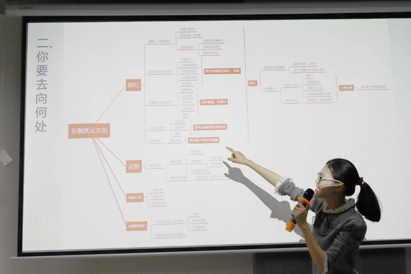 首先,师姐根据职业的类型和就业方向,倒推回我们现阶段应该做哪些努力,来帮助自己找到理想的工作。师姐以自身所处的金融行业为例,给大家介绍了金融业的各种单位和就业岗位,并教大家用图表的方式,使各种信息有秩序地罗列在眼前,有助于分析自己的就业意向。