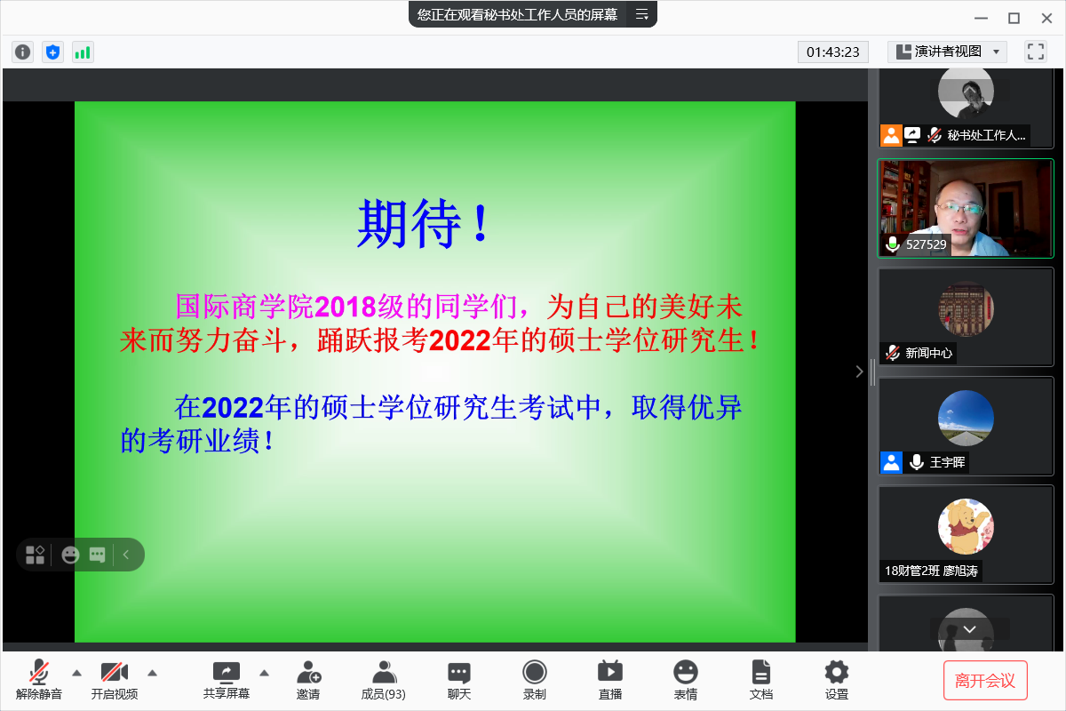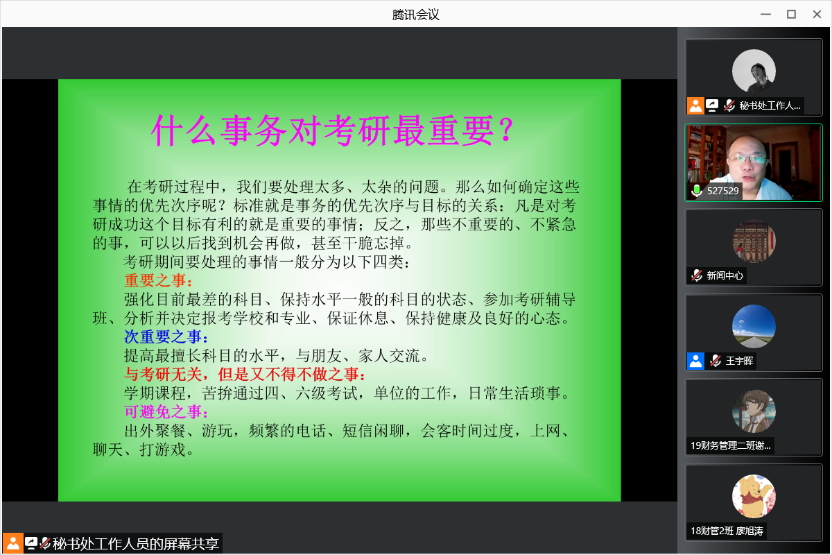 6月22日晚,Betway必威西汉姆联邀请地理与旅游学院唐晓春教授在“腾讯会议”平台为Betway必威西汉姆联学生举办考研动员与指导讲座,Betway必威西汉姆联副院长王宇晖、学院学生工作负责人张鹏程、学院全体辅导员以及102名学生代表参加讲座。