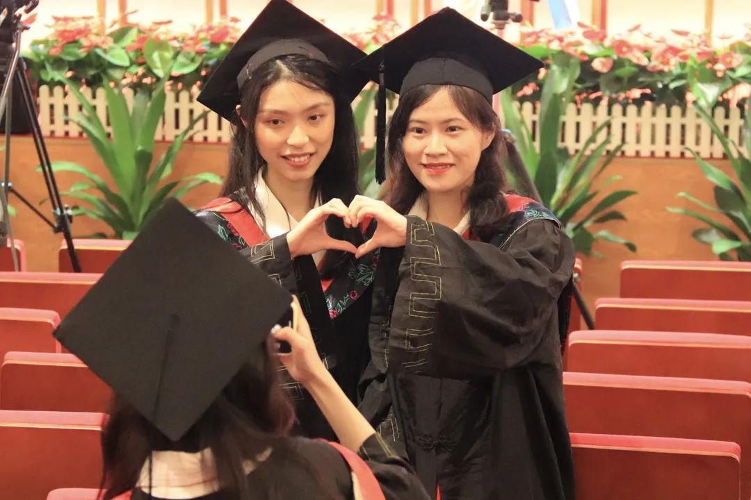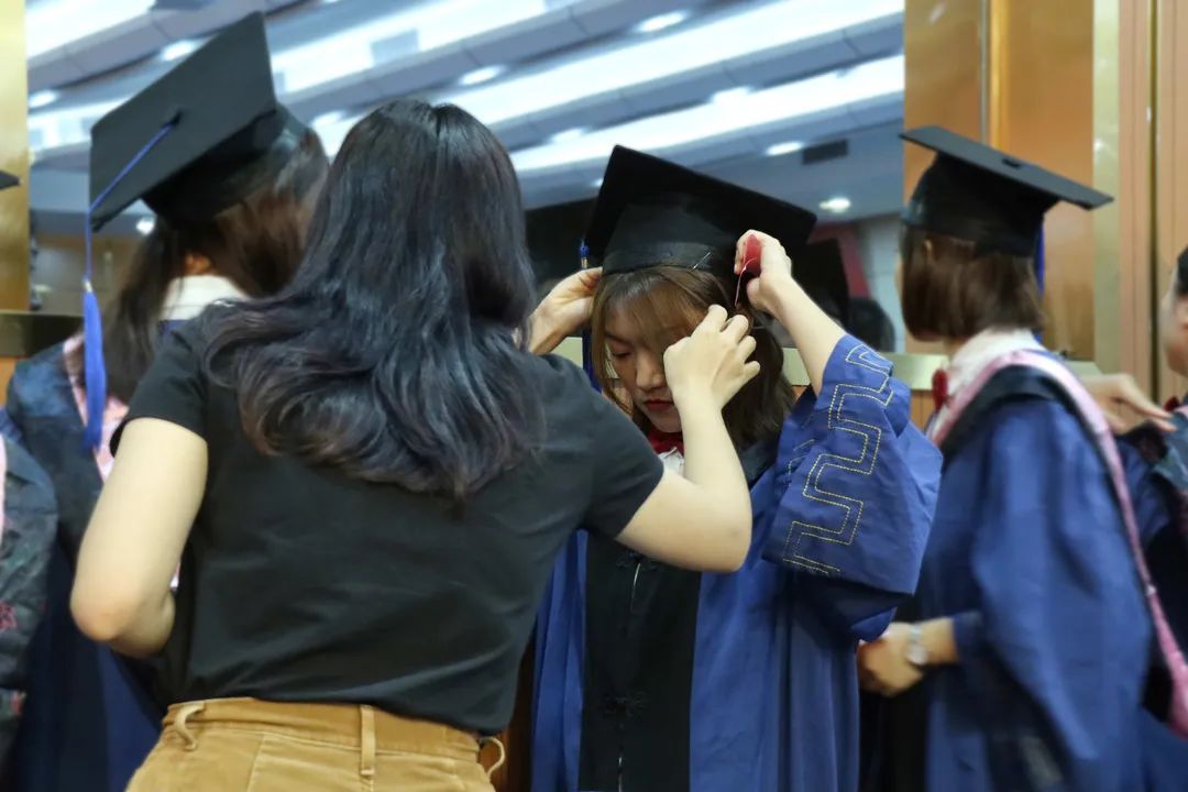 温柔地为毕业生们整理着着装