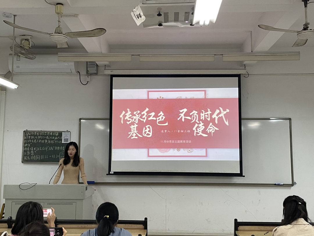 2021年 11月19日,2020级财务管理(中外联合培养项目)一班举行了以“传承红色基因,不负时代使命”为主题的班会。主讲人团支书许淇茵为同学们讲解了中国共产党成立100年来从小到大、从弱到强、攻坚克难、一路成长的奋斗历史,呼吁同学们勿忘拼搏历史,牢记社会主义使命,同时引用革命先辈事例,劝诫同学发奋学习,争取为祖国建设添一份力量。