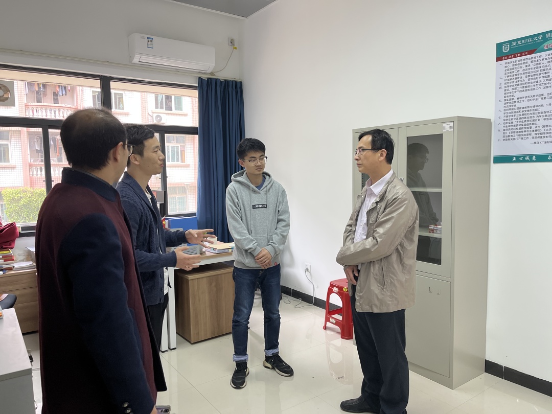 苏明华部长到有为书院学生工作办公室查看驻学生宿舍辅导员的工作情况,了解学院在疫情防控工作中主要做法、存在的问题和难点。苏部长指出,目前疫情防控形势严峻,要按属地、学校相关要求做好疫情防控工作,同时,要深入学生宿舍,及时了解学生学习生活情况和需求,帮助学生解决实际问题和困难。