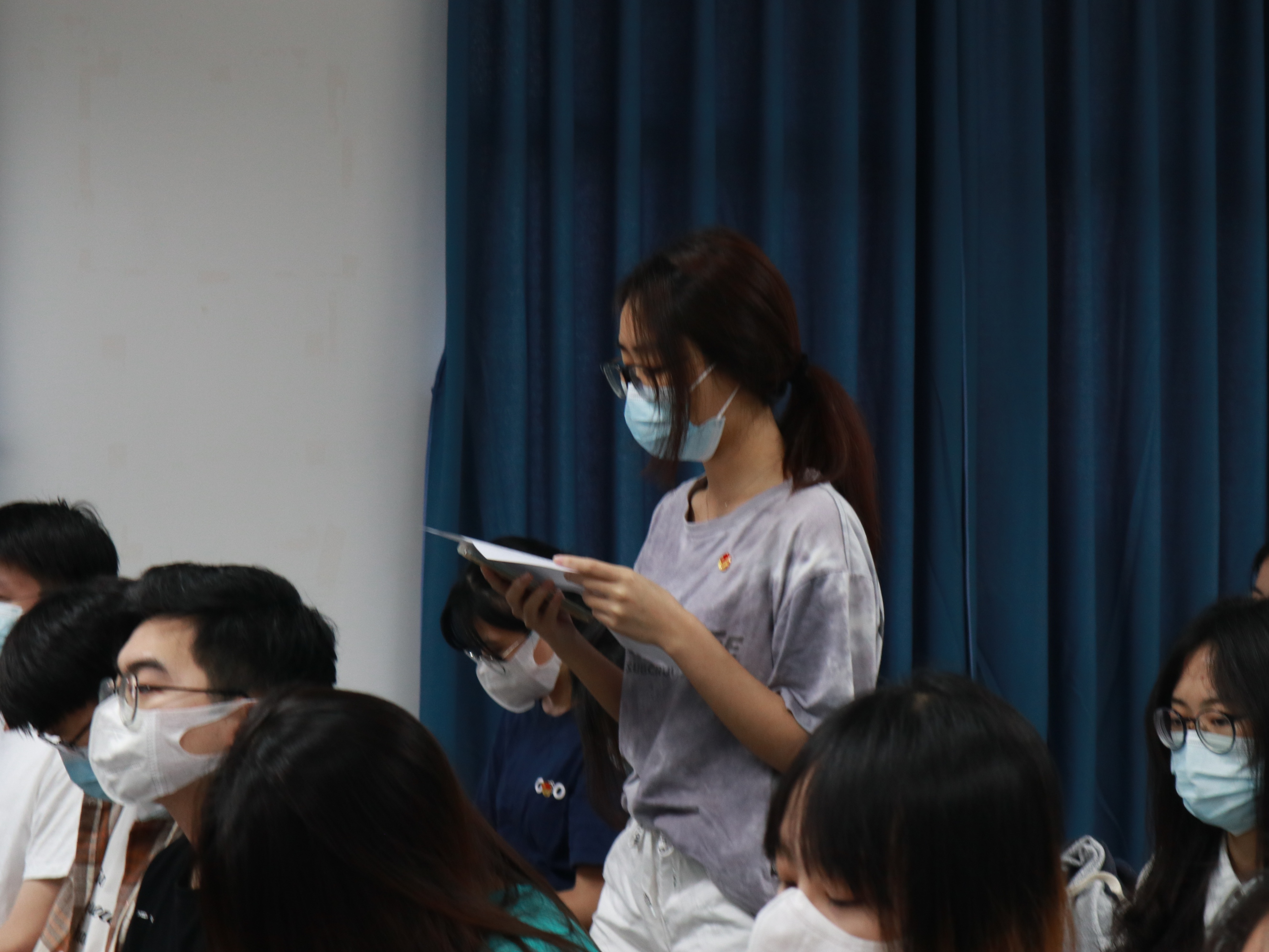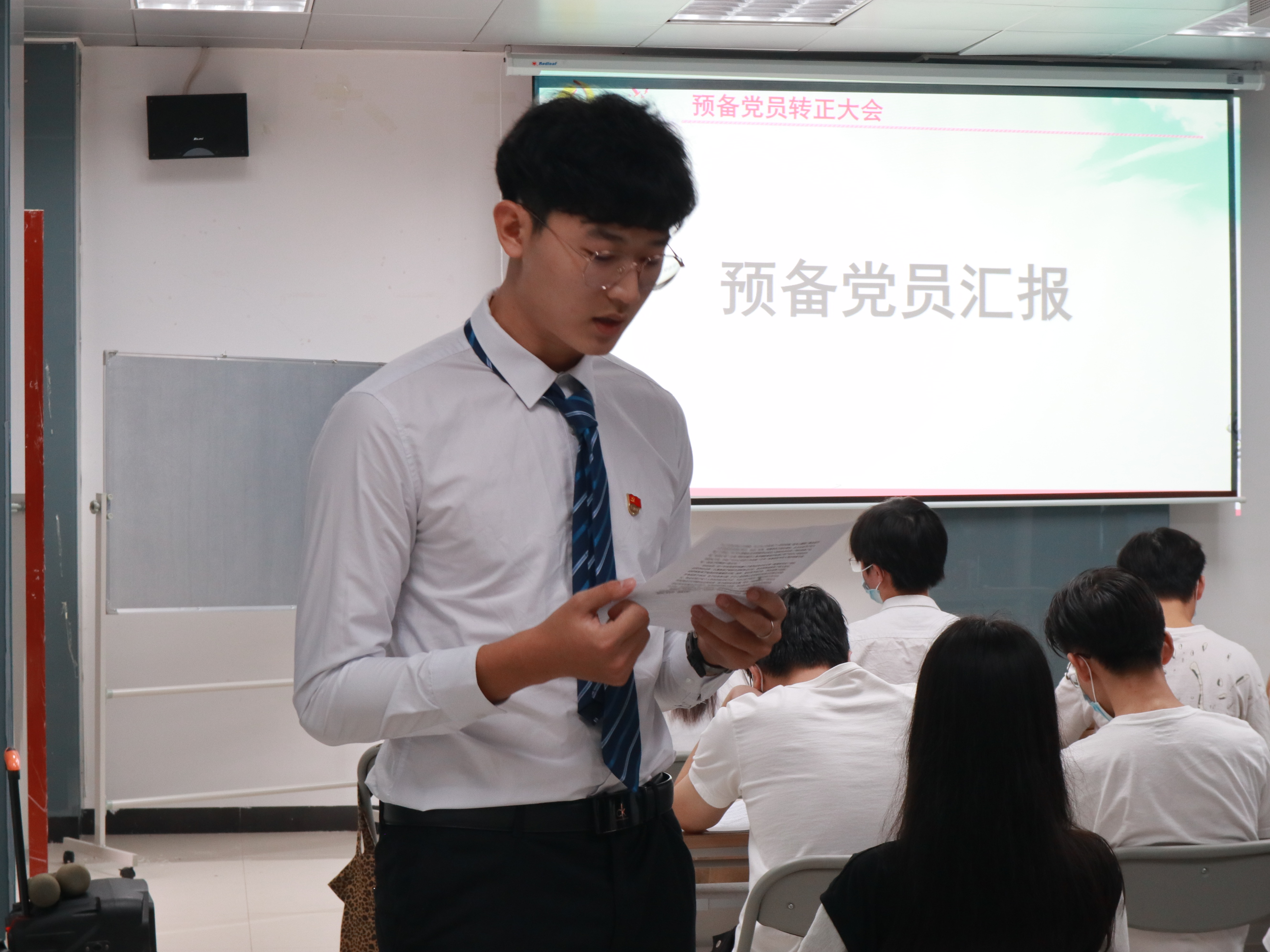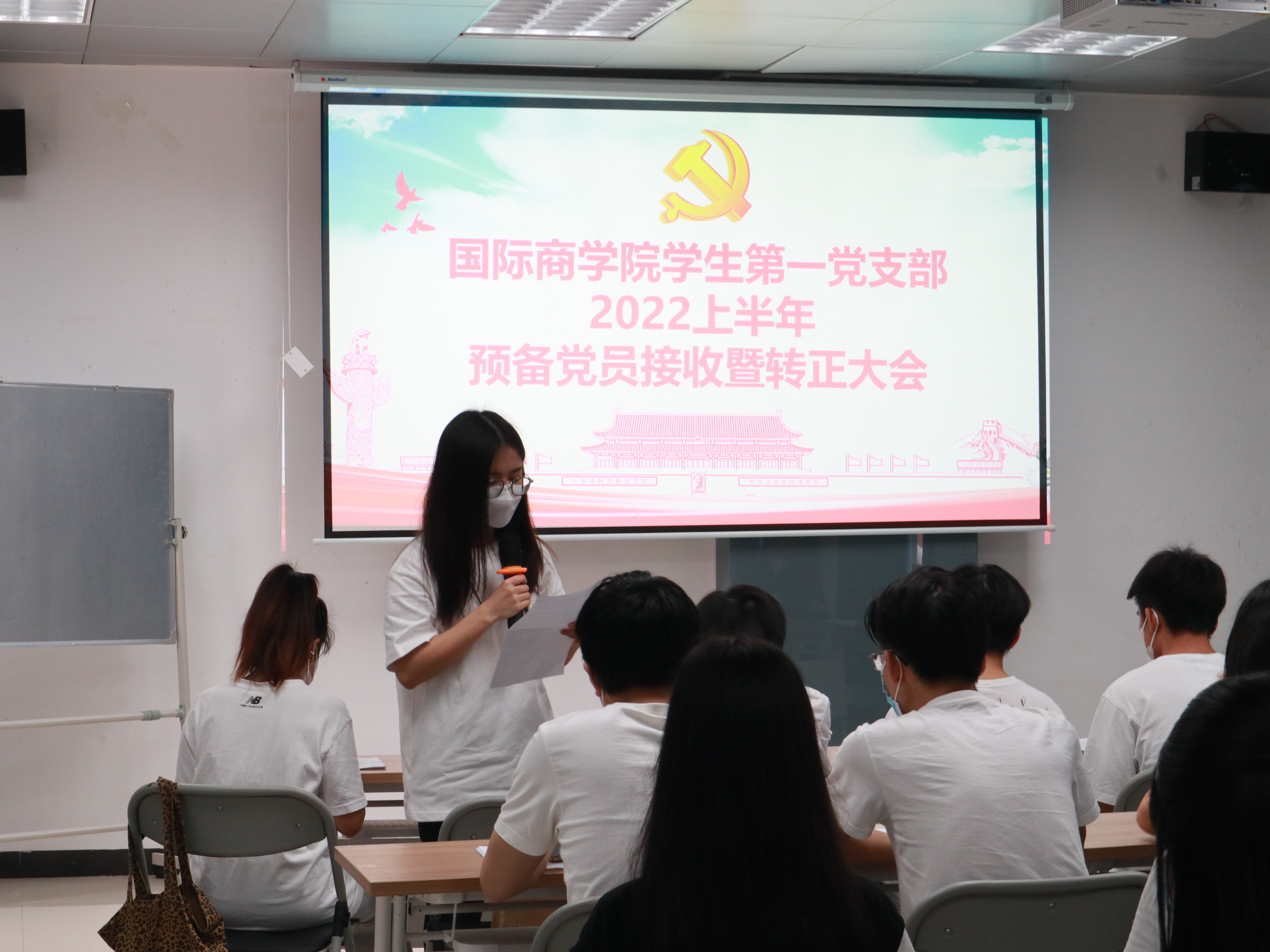 讨论接收预备党员支部大会严格按照流程进行。谭莎莎、林晓萍、彭俊轩、曾可言、杨梅愉、田育杭六名发展对象逐一宣读转正申请,汇报本人的入党动机、思想认知、学习生活等情况,并表达了入党的期望和决心。随后,入党介绍人陈迪、李莹同志对六名发展对象在考察期内的表现作了相关介绍。支部委员会向参会同志汇报发展对象的政审材料和群众调查结果并对发展对象进行问答。经参会党员投票,支部委员会讨论研究,确定谭莎莎、林晓萍、彭俊轩、曾可言、杨梅愉、田育杭同志为中共预备党员。