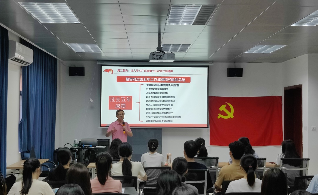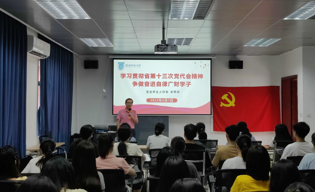 苏部长围绕广东省第十三次党代会情况介绍、深入学习广东省第十三次党代会精神、奋力谱写多彩广东现代化建设新篇章三个部分展开阐述。第一部分,苏部长介绍了省第十三次党代会的召开背景和基本情况;第二部分,苏部长对省第十三次党代会精神进行深入解读,并介绍了广东省过去五年在政治、经济、文化等方面取得的成绩与经验;最后,苏部长解读了大会的总体要求和广东省今后五年的发展目标以及“1+1+9”工作部署和九项重要工作任务,并勉励在场的同学们要学习贯彻大会精神要求,在追求卓越上下功夫,争做奋进自律广财人。