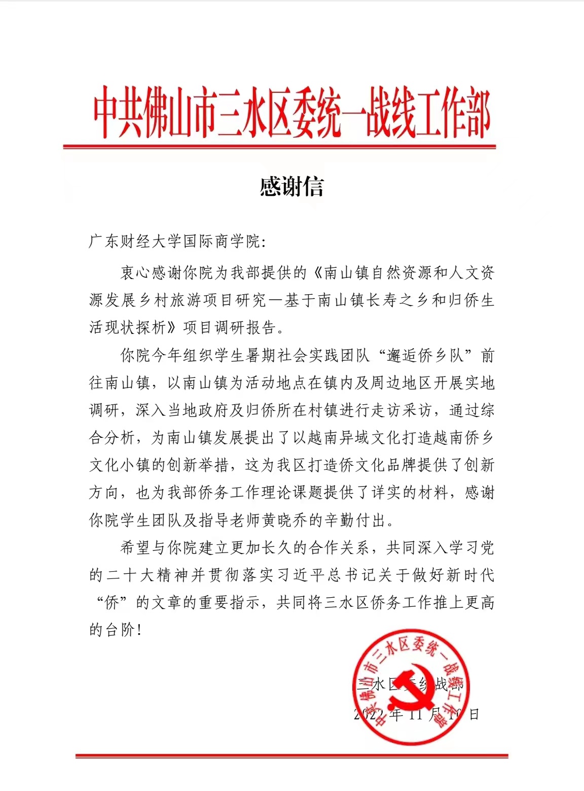 该团队以南山镇为活动中心,在镇内及周边地区开展实地调研,深入当地政府及归侨所在村镇进行走访、采访。通过综合分析,最终形成项目调研报告,为南山镇发展提出了以越南异域文化打造越南侨乡文化小镇的创新举措,为三水区打造侨文化品牌提供了创新方向。三水区委统战部来信表示感谢,并表示希望与学院建立更加长久的合作关系,共同深入学习党的二十大精神并贯彻落实习近平总书记关于做好新时代“侨”的文章的重要指示,共同将三水区侨务工作推上更高的台阶!