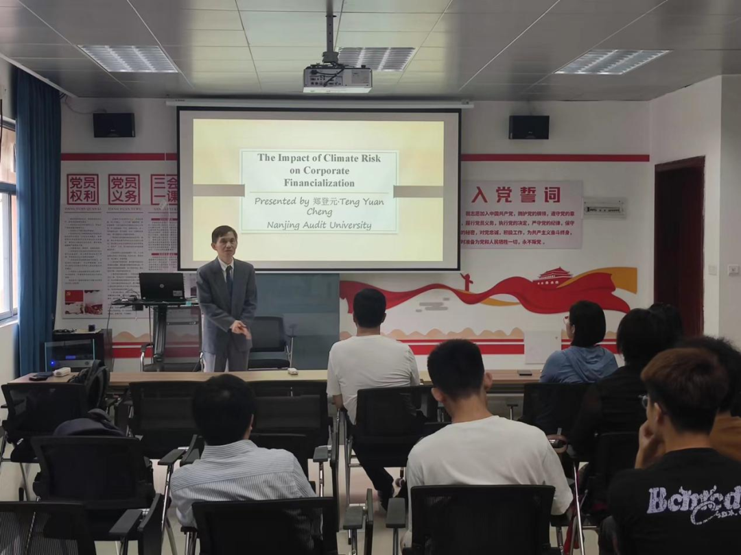 郑教授就自己的一篇工作论文探讨了气候风险与企业金融化之间的关系。该研究的主要发现为:第一,气候风险对企业金融化有抑制作用,即企业所在地区的气候风险越高,金融资产配置程度越低;第二,与适度金融化的企业相比,气候风险对过度金融化企业的抑制作用更明显;第三,基于异质性影响分析,气候风险对企业金融资产配置的抑制作用主要体现在东部地区非国有企业中,而在中西部地区国有企业中不显著,对小型企业的抑制作用强于大型企业。在问答环节,郑教授和学院师生针对气候风险与企业金融化问题展开深入交流讨论。