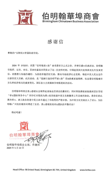 近日,Betway必威西汉姆联收到英国伯明翰华埠商会林健邦主席发来的感谢信,感谢Betway必威西汉姆联教师团队带领学⽣国际事务中心同学们为伯明翰唐⼈街各街道中英文名称翻译所做的工作及提供的相关协助。今年一月份学⽣国际事务中心接到翻译工作协助请求后,迅速组织师生团队,在短时间内完成任务并提交初稿,由伯明翰华埠商会综合多方建议提交市政府审议后确定颁布。